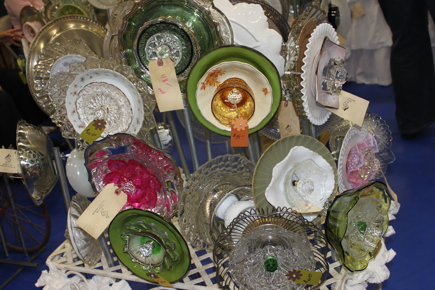 out of cups, saucers, knobs, plates, silver plated bowls and plates and many other great thrift store finds. Drill holes in the items (most will already be drilled), design your own one of a kind flower, put it together on a piece on conduit with a long screw and spacers, and put everything together with a wing nut. Call 843-7852 or 323-8465 for questions. $55